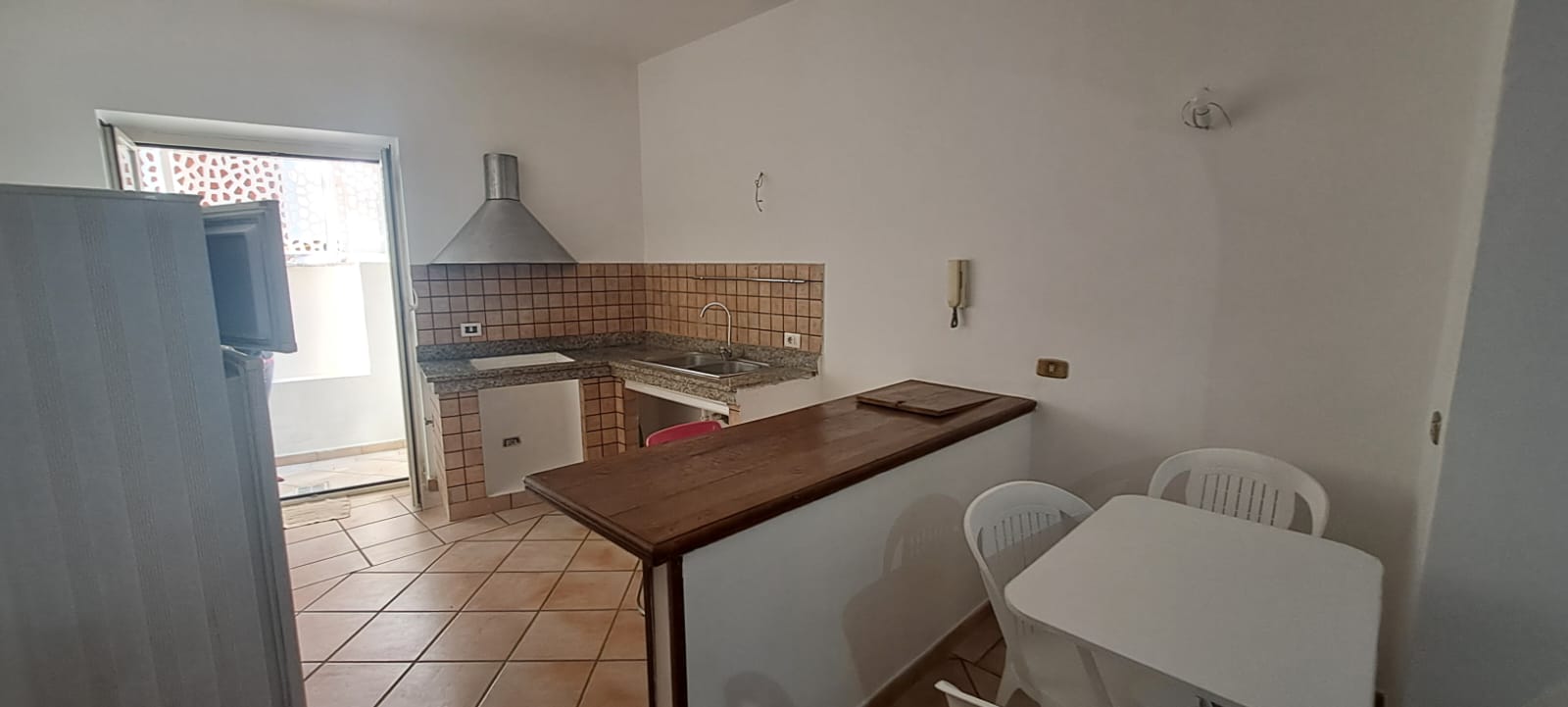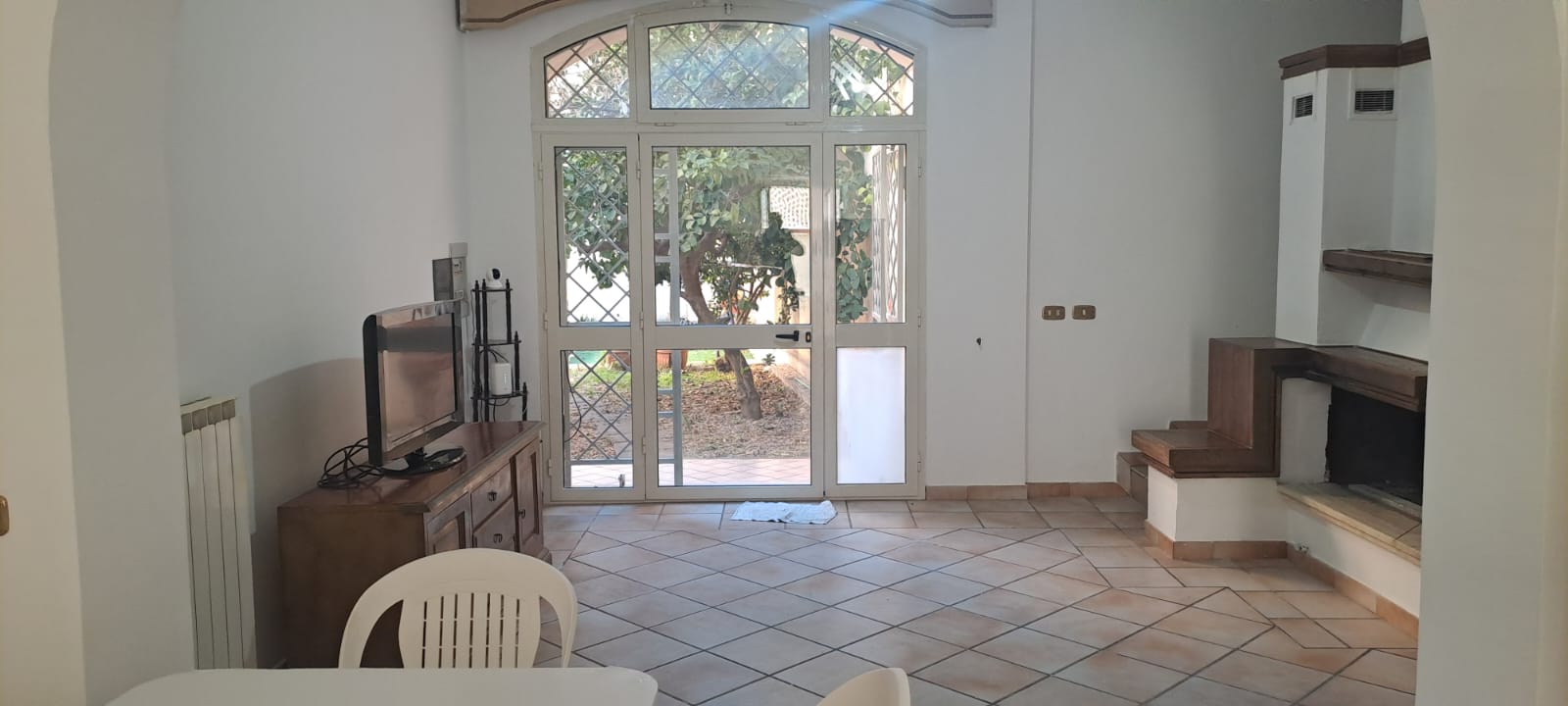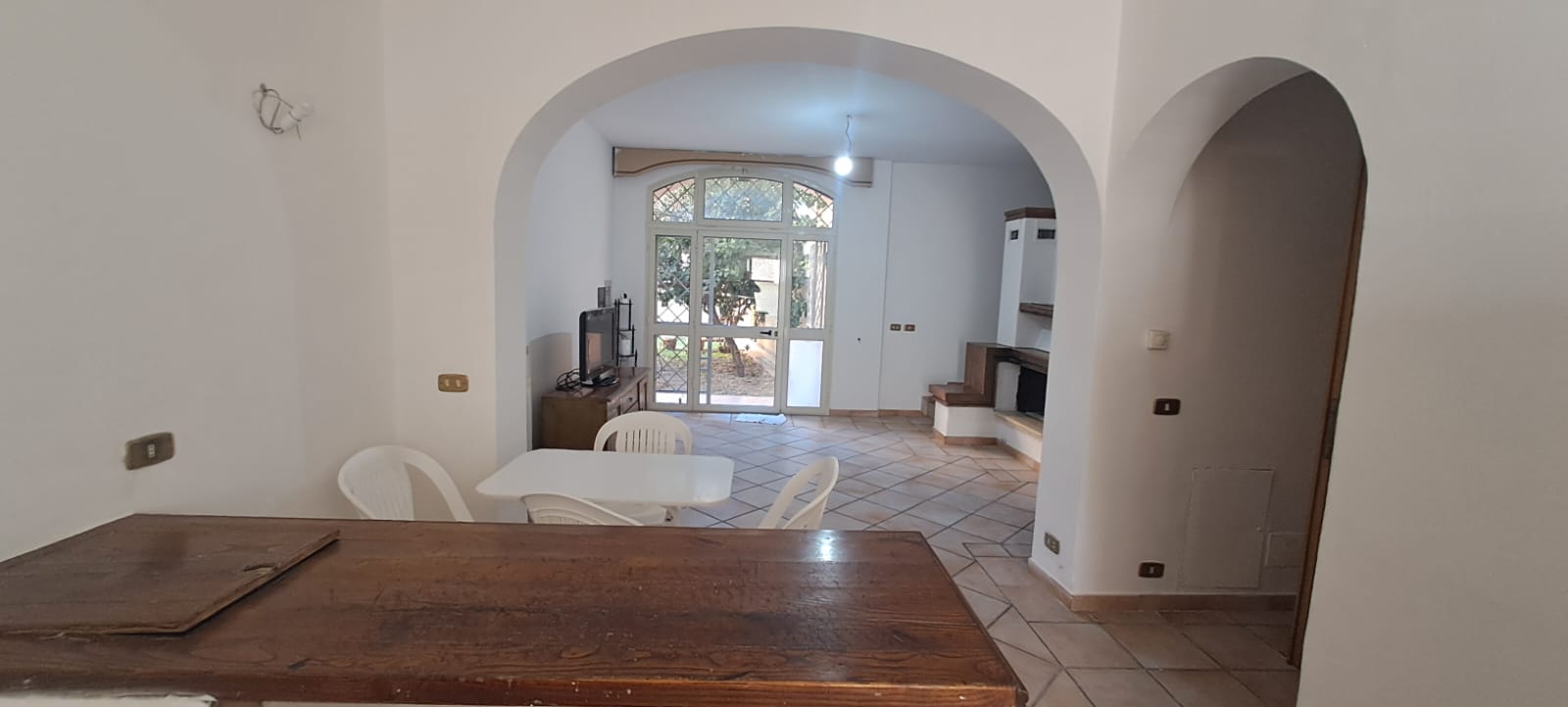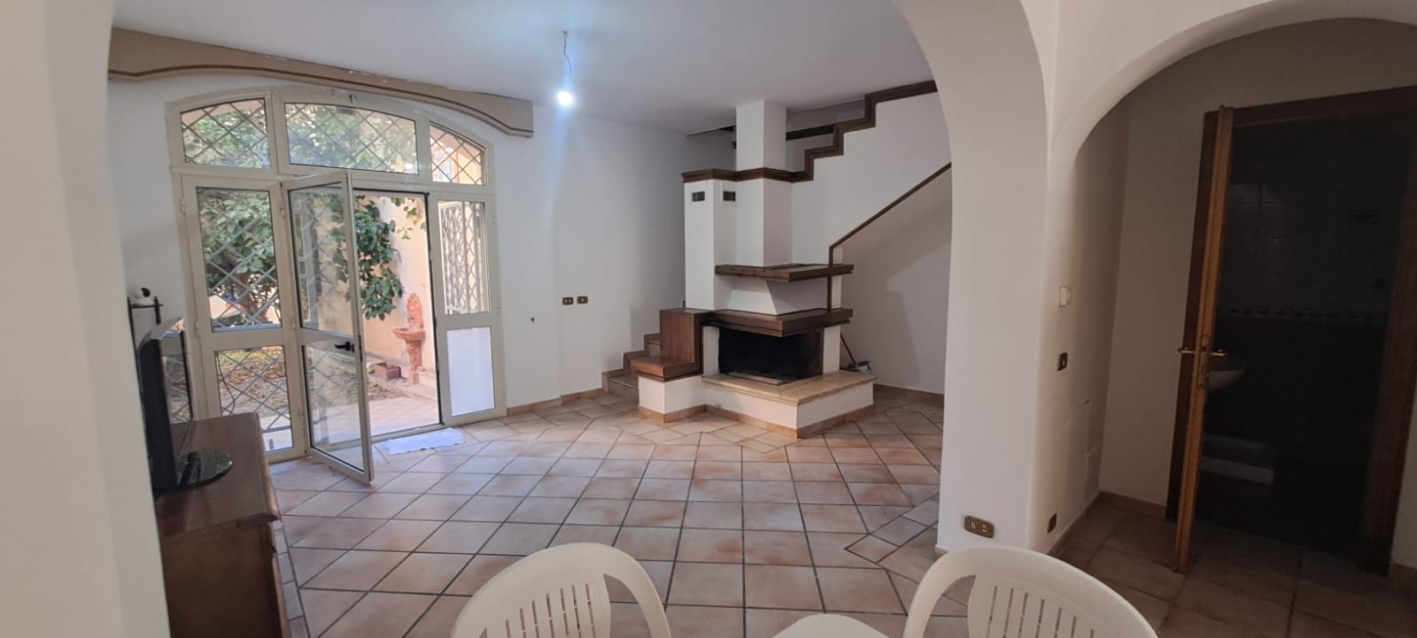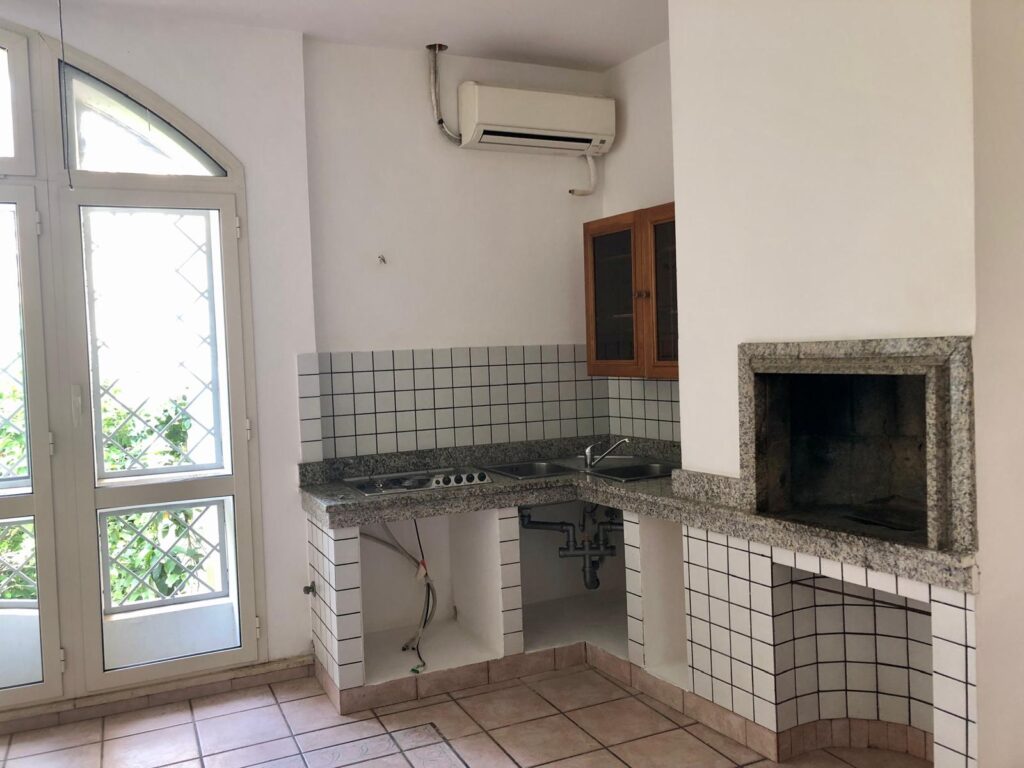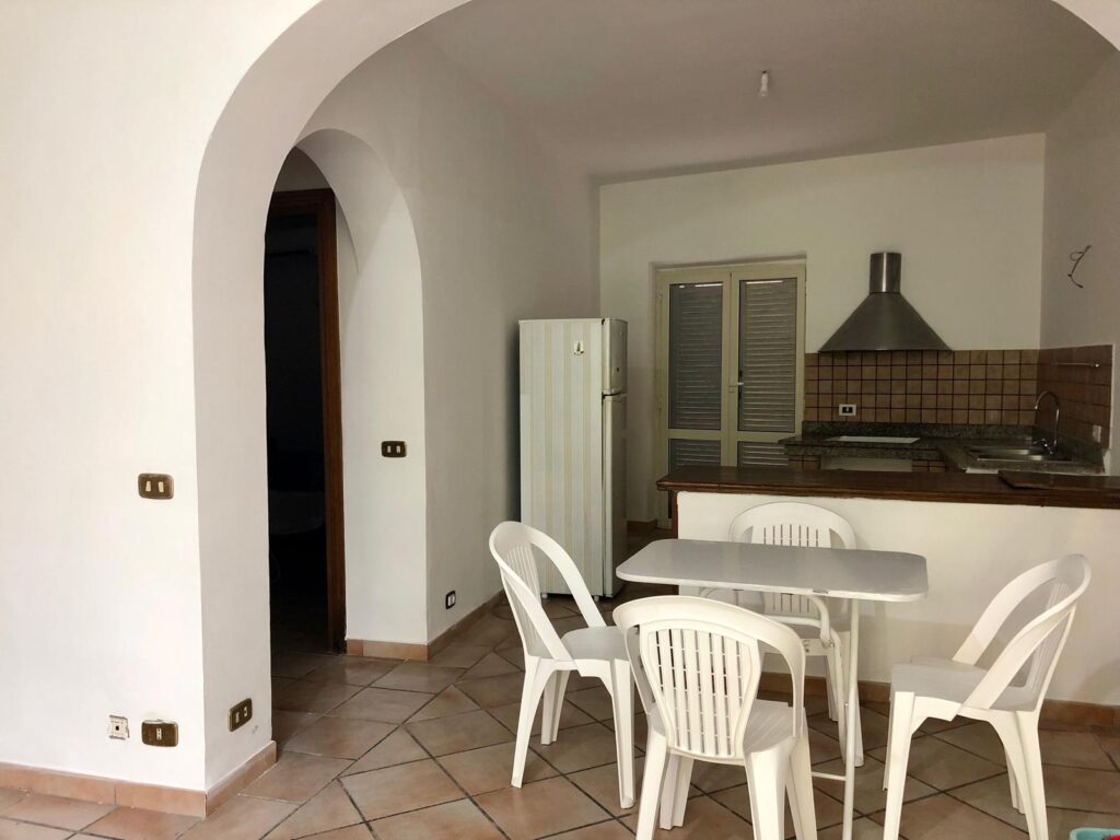 •La casa è composta al piano terra da ingresso confluente alla sala con camino formando un comodo “open space” che si unisce all’ampia cucina a vista, e adiacente alla stessa si accede ad un balcone dotato di una cabina doccia esterna; a lato della sala una camera matrimoniale ed un bagno.